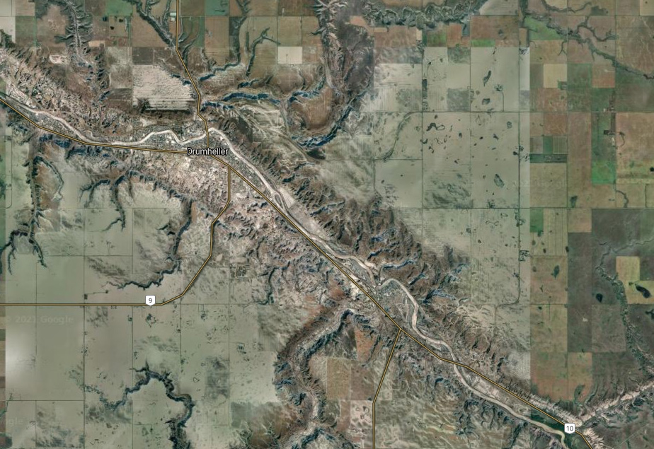 Everything about Drumheller’s history comes down to its unique geology. When the last coal mines shut down in the 70s, the town pivoted to tourism. Alberta’s rich seams of coal and oilfields also give up skeletons hidden for millenia. Drumheller, Dinosaur Capital of the World, is home to the world-class Royal Tyrrell museum, one of the finest museums I’ve had the pleasure to visit. They hired Kurzgesagt to create videos and displays. They commissioned artists to create striking glass and wire art illuminating their dinosaur fossils, evoking their ghosts and giving life to the bones so you can better imagine the animals they were. Their stunning Black Beauty T-rex is presented with striking effect, a massive wall of stone with protruding black bones catching the light, the creature’s open jaws roaring its resistance to death. Their extensive collection of fossils is displayed in dynamic scenes — a saber tooth leaping onto a mammoth realizing its fate too late — a pair of tiny fierce dinosaurs slinking along together. Honestly, the trip to Drumheller is worth it for the museum alone.