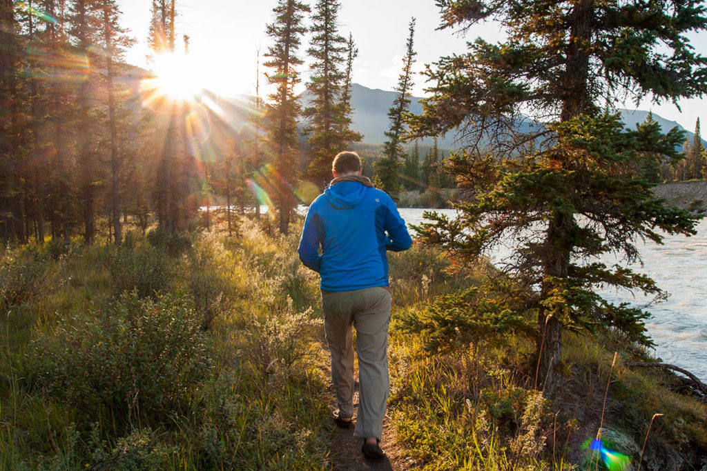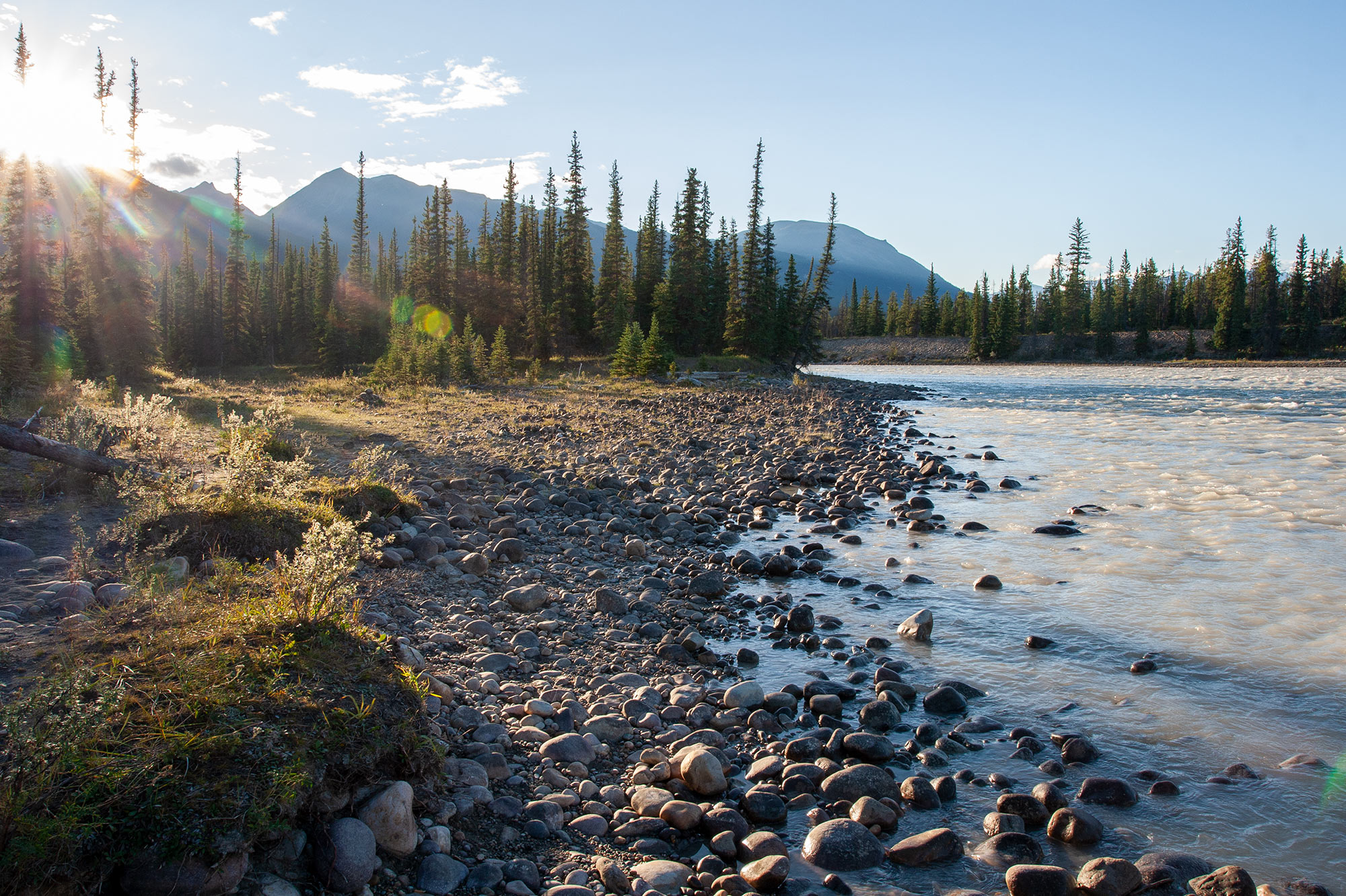 The campground sits next to the Athabasca River, its milky waters flowing to the Arctic Ocean. A path meanders along the shore, leading down to a rocky bed spotted with grasses and stunted trees.