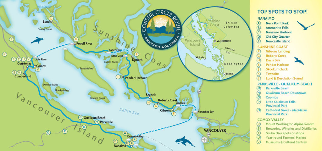 See our trip report for the entire Vancouver Island – Sunshine Coast road trip. For more research, check out the “Coastal Circle Route” promoted by B.C.